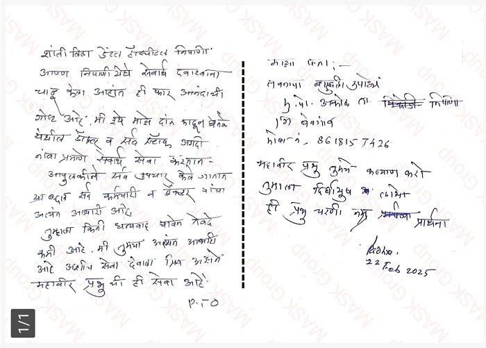 अक्कोळ येथील तवनाप्पा उपाध्ये यांच्या परिवारातील रुग्णांस येथे उपचार घेतले आणि त्यांना अत्यंत योग्य उपचार मिळाल्याचा अनुभव आला. त्यांनी या सेवार्थ दवाखान्याला आभार पत्र व अभिप्राय पत्र देऊन आपल्या भावना व्यक्त करून धन्यवाद दिले.